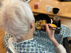 普段はほとんど職員が食事を手伝っている方が丼椀を手にとり、ご自分で食べ始めました。